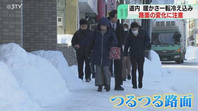 暖かさ一転冷え込み 歩道はツルツル路面… 各地でプラスの気温か 路面の変化や落雪に注意