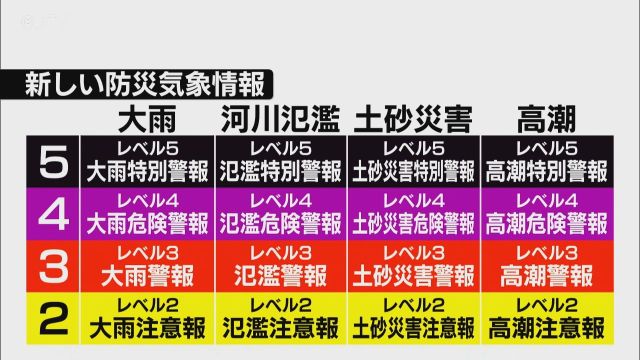 新しい情報では、「大雨」「河川氾濫」「土砂災害」「高潮」の4つについて、警戒レベルの数字と、「特別警報」「警報」などレベルごとに統一した名称を組み合わせて発表します。