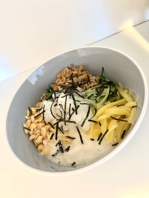 七味グリーン麺揚げ玉、納豆、大根おろし、のり、長芋、ねぎ、たくあんの細切り、唐辛子 -