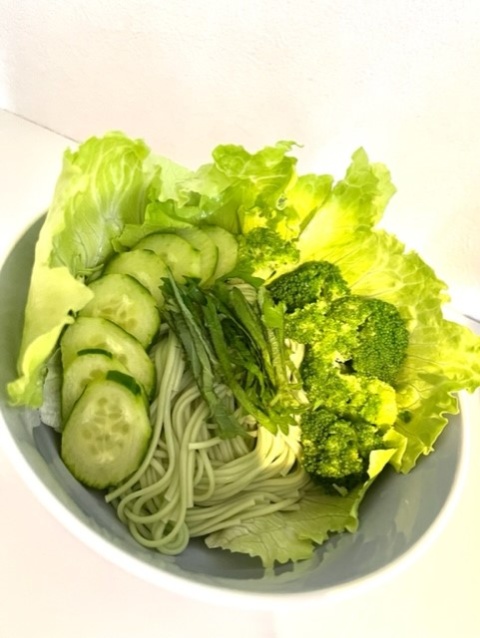 グリーングリーン麺レタス、ブロッコリー、きゅうり、刻み大葉