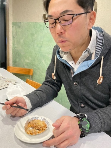 ②よく混ざって粘りが出たら、スプーンで4等分に分け、アルミカップに取り分けます。
