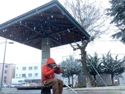 公園内の芝生も雪で真っ白。寒い体がも温まるお弁当でした。