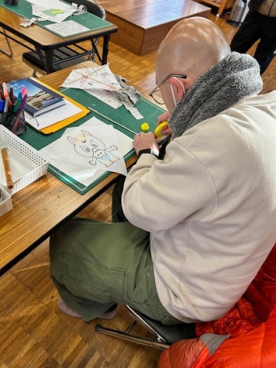 凧にどさんこくんの絵を描くじゅんぺいさん