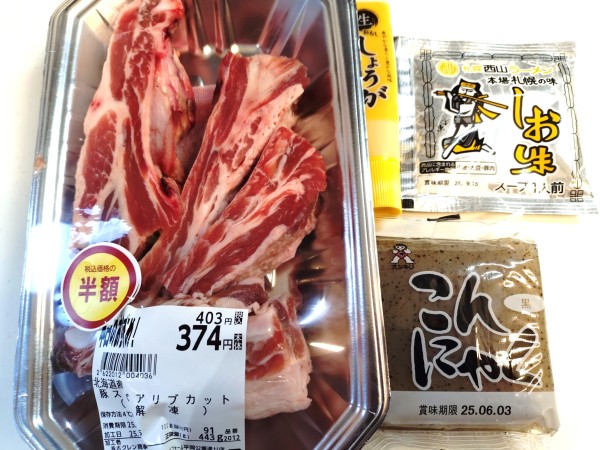 ・材料:豚のスペアリブ、こんにゃく、チューブショウガ