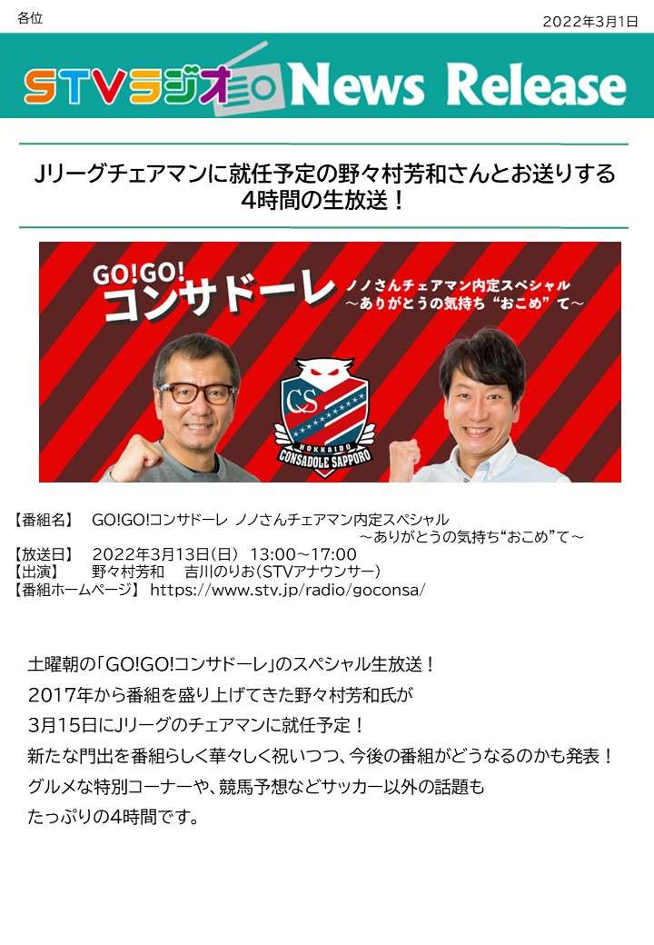 3月13日(日)『GO!GO!コンサドーレ ノノさんチェアマン内定スペシャル〜ありがとうの気持ち“おこめ”て〜』