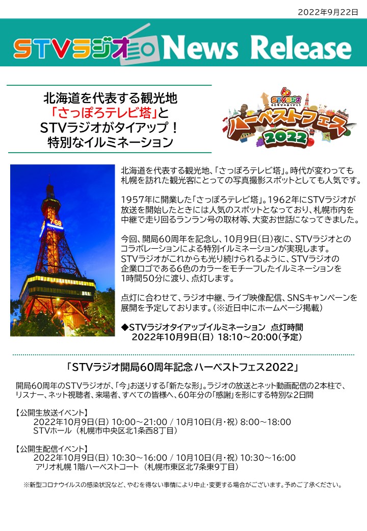 10月9日(日) 北海道を代表する観光地「さっぽろテレビ塔」とSTVラジオがタイアップ!特別なイルミネーションが決定!