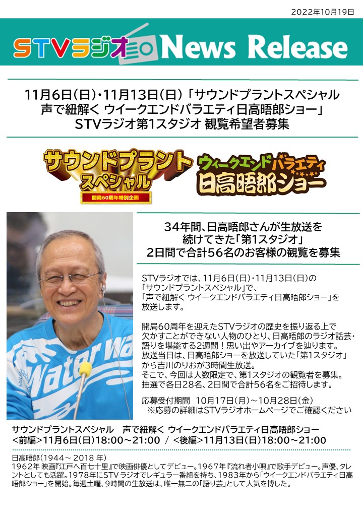 「サウンドプラントスペシャル 声で紐解く ウイークエンドバラエティ日高晤郎ショー」STVラジオ第1スタジオ 観覧希望者募集
