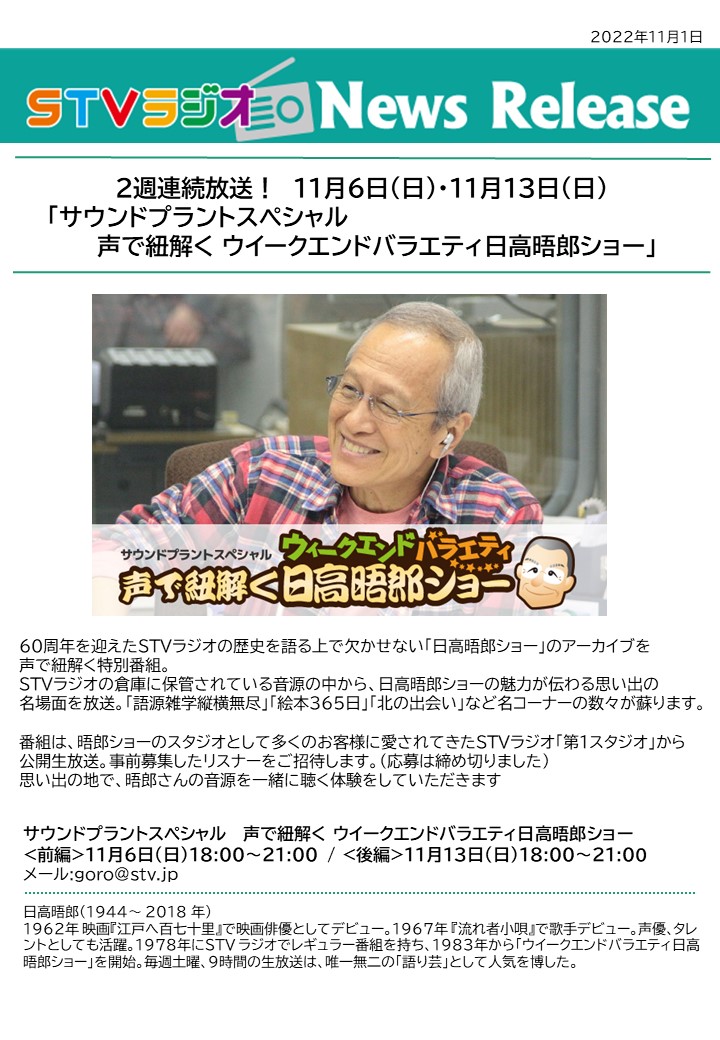 2週連続放送!「サウンドプラントスペシャル 声で紐解く ウイークエンドバラエティ日高晤郎ショー」