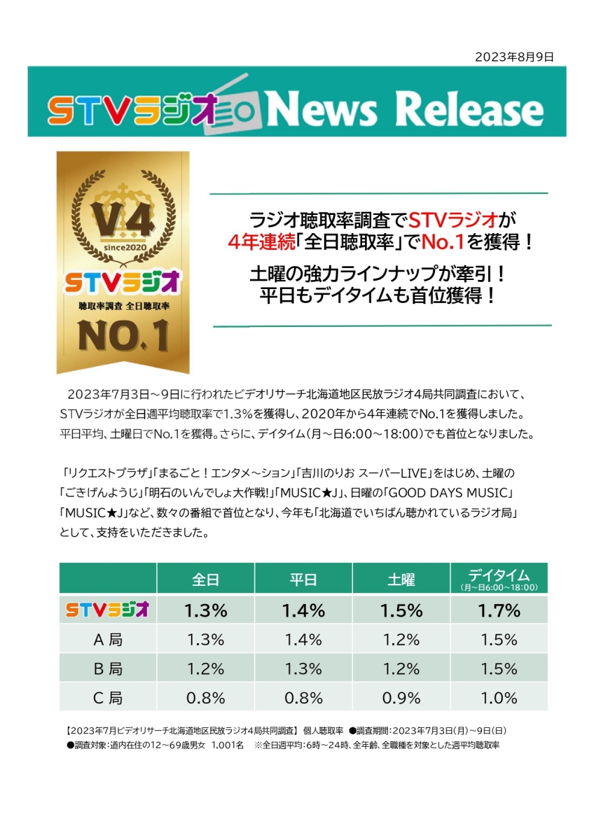 2023年聴取率調査の結果、STVラジオが『4年連続 北海道で一番聴かれているラジオ局』になりました。