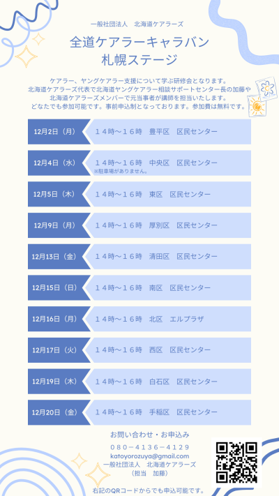 12月は「北海道ケアラーキャラバン」札幌ステージ加藤さん「全10区まわるため、たくさんの札幌の方々にきてもらいたいと思っています。一般市民が参加できるケアラーの研修会は希少です。11月から江別市で月1でケアラーの居場所『ケアラーズカフェ』を開催しています。12月には当別町でも開催します」https://ebetsu-carers.com/
