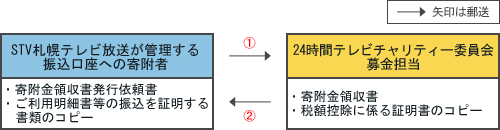(2)24時間テレビチャリティー委員会 募金担当が(1)の書類を確認後、「寄附金領収書」と「税額控除に係る証明書のコピー」を「寄附金領収書発行依頼書」に記載の住所へ郵送致します。
