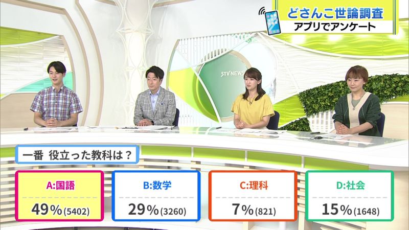 7月4日世論調査 7/3(木) 7月3日世論調査 7/7(月) 7月7日世論調査 2025年7月4日(金) きょうは「一番 役立った教科は?」を調査しました。 結果は… A:『国語』 49% B:『数学』 29% C:『理科』 7% D:『社会』 15% でした。 ご参加ありがとうございました。 7/3(木) 7月3日世論調査 7/7(月) 7月7日世論調査