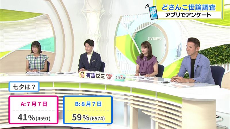7月7日世論調査 7/4(金) 7月4日世論調査 7/8(火) 7月8日世論調査 2025年7月7日(月) きょうは「七夕は?」を調査しました。 結果は… A:『7月7日』 41% B:『8月7日』 59% でした。 ご参加ありがとうございました。 7/4(金) 7月4日世論調査 7/8(火) 7月8日世論調査