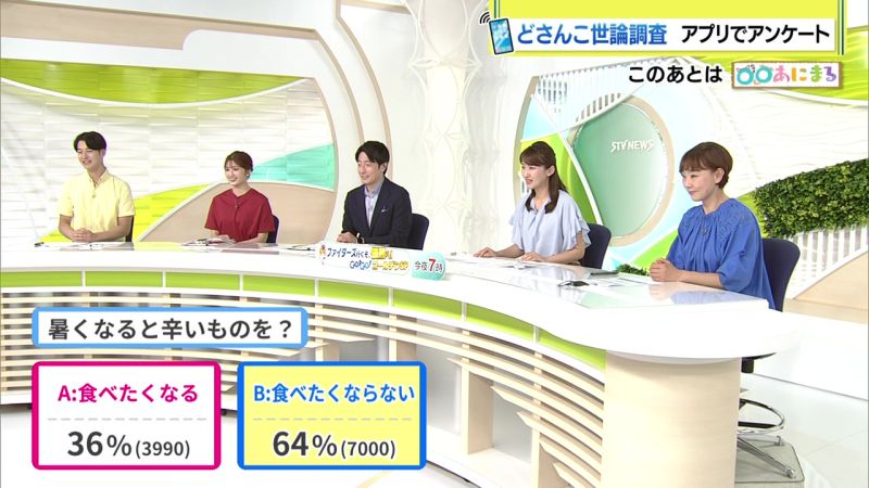 7月18日世論調査 7/17(木) 7月17日世論調査 7/21(月) 7月21日世論調査 2025年7月18日(金) きょうは「暑くなると辛いものを?」を調査しました。 結果は… A:『食べたくなる』 36% B:『食べたくならない』 64% でした。 ご参加ありがとうございました。 7/17(木) 7月17日世論調査 7/21(月) 7月21日世論調査