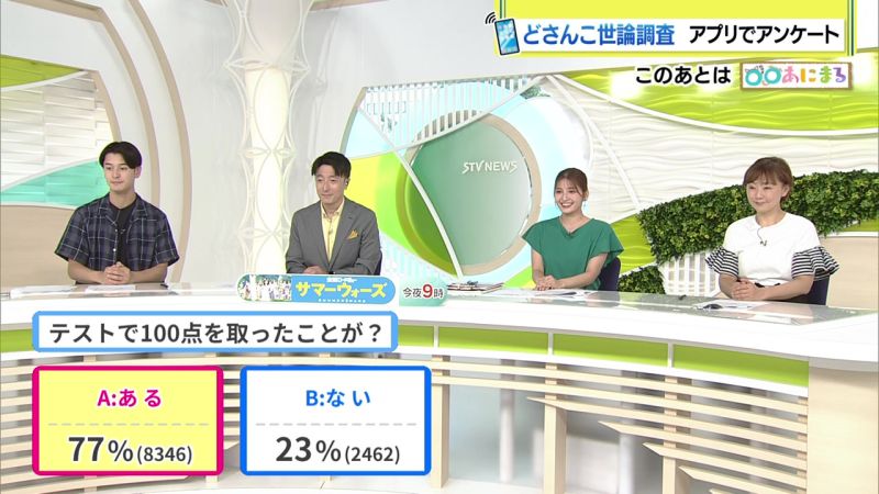 8月1日世論調査 7/31(木) 7月31日世論調査 8/4(月) 8月4日世論調査 2025年8月1日(金) きょうは「テストで100点を取ったことが?」を調査しました。 結果は… A:『ある』 77% B:『ない』 23% でした。 ご参加ありがとうございました。 7/31(木) 7月31日世論調査 8/4(月) 8月4日世論調査