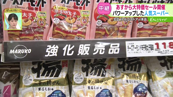 取扱商品も増えました。「強化販売商品」というPOPは、“お得商品”が置かれている目印です。
