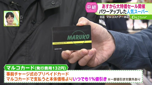 自社カード「マルコカード」が誕生しました。レジでの支払いに利用すると、いつでもその場で本体価格から1%割引となります。