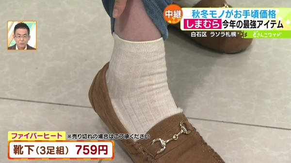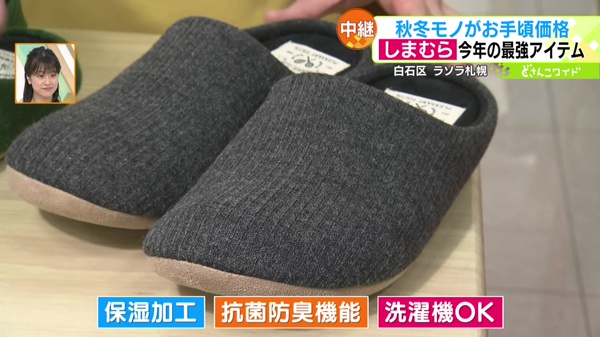 続いては、お家の中で使えるあったかアイテムをご紹介しました。温かいだけじゃなく、長時間履いても疲れにくい構造になっています。