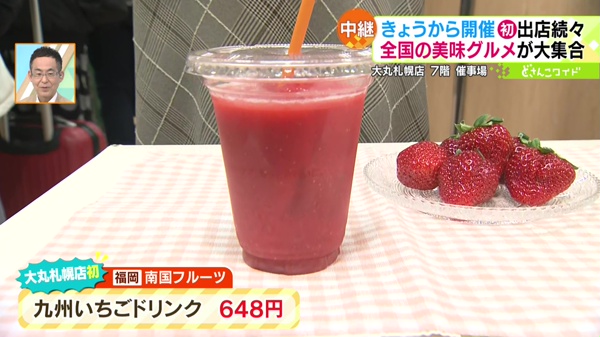 ●【福岡】南国フルーツ「九州いちごドリンク」648円1日に1000杯売り上げた大人気のドリンク。3種類のイチゴから選べます。今回は一番人気の“あまおう”をいただきました。