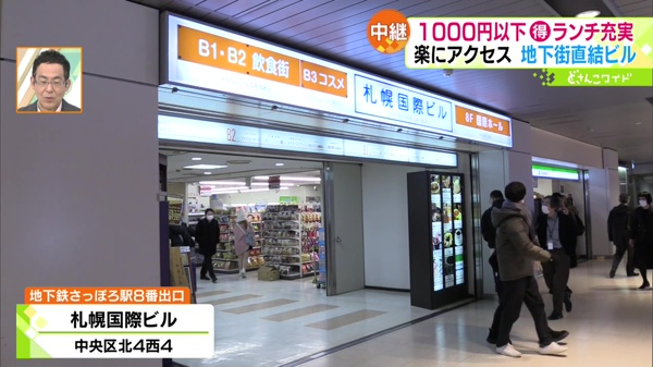 地下鉄さっぽろ駅の8番出口付近にあるビル。地下飲食街には9つの飲食店が集結しています。