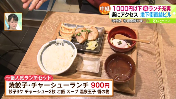 全国に130店舗以上展開している、肉汁溢れる餃子が美味しい人気店。一番人気のランチセットは「焼餃子・チャーシューランチ」です。