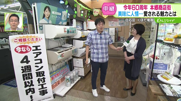 カセットテープなど懐かしい商品も揃う町の電気屋さん。現在、エアコン取付工事は4週間以内でできるそうです。