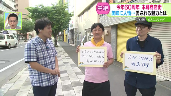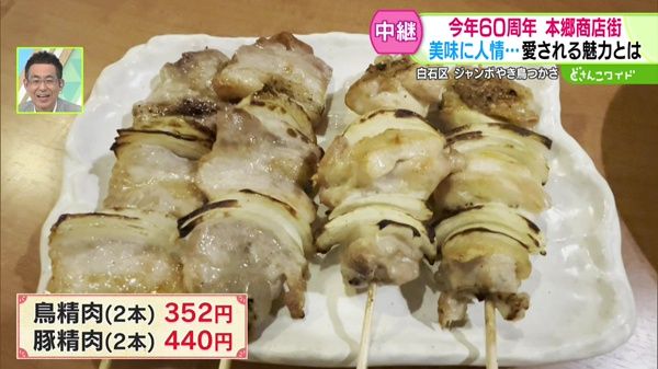 (写真左から)北本アナ、「じゃんぼ焼きとりつかさ 本店」久保田康二さん、「本郷商店街」理事長・宇山誠治さん -