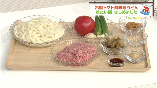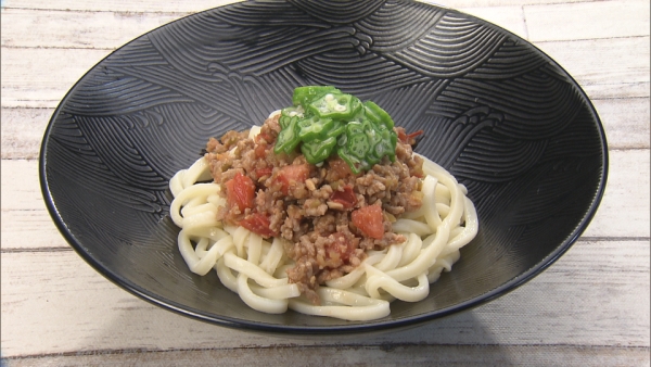フレッシュトマトの、肉味噌だれをかけた冷やしうどんです。コクがあり栄養バランスも整った逸品です、暑い日にはタレも冷やしておくと良いでしょう。トマトはフレッシュさを失わない程度に、サッと火を通すのがポイントです。
