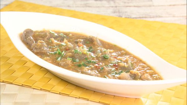 (1)コンニャクは、塩でもんでから水で流し、スプーンで一口大にそぎ落とします。長ネギ、ショウガ、ニンニクはみじん切りにします。調味料は合わせておきます。長ネギの青身はあしらい用に別にしておきます。