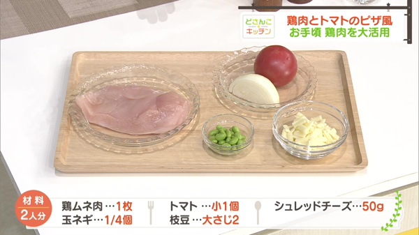 鶏ムネ肉1枚、塩・コショウ各少々、酒大さじ1杯、玉ネギ1/4個、トマト小1個、枝豆大さじ2杯、シュレッドチーズ50g