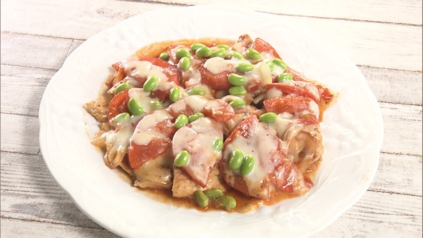 (3)ソースの調味料を合わせ、鶏肉全体にのばし、玉ネギ、トマト、枝豆、シュレッドチーズの順にのせ、フタをしてチーズが溶けるまで焼きます。
