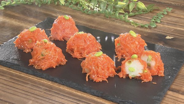 はんぺんを潰して団子にし、ニンジンを周りにつけて蒸した、色鮮やかでおもてなし料理やお弁当、おかずに嬉しい一品です。栄養バランスがとても良く、優しい味わいです。ニンジンは、千切りつき器でつく事で周りにまぶしやすくなります。片栗粉を加えることで、形を安定させ、艶が出ますので綺麗に仕上がります。