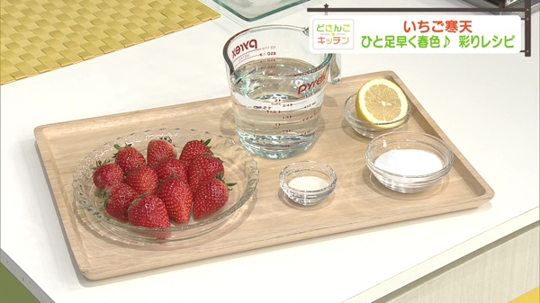 いちご250g、レモン1/2個、水カップ2杯、粉寒天4g、砂糖50g