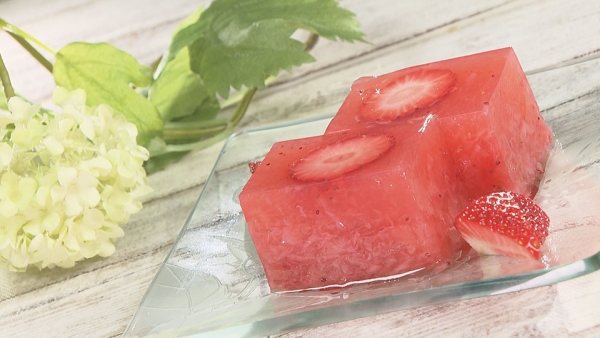 イチゴを潰して寒天液で固めます。いちごをそのまま食べる時より風味が豊かになり、色も鮮やかになります。生クリームやフレッシュのいちごを添えると、特別なデザートになりますが、作り方は簡単!幾つにも切り分ける事も出来ますので大変重宝な一品です。
