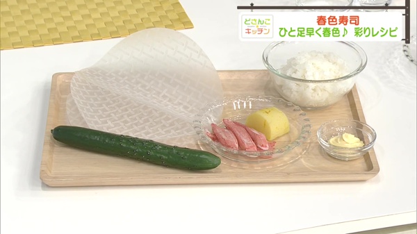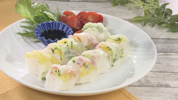 生春巻きの皮は、実はヘルシーな食材。火を通さずに使えるので、日常でも使いしやすい食材です。生野菜やエビを巻いて食べるのが一般的ですが、今回は酢飯と彩りのよい、手ごろな食材で巻きずしにしてみました。見栄えもよく、食卓を彩ってくれます。