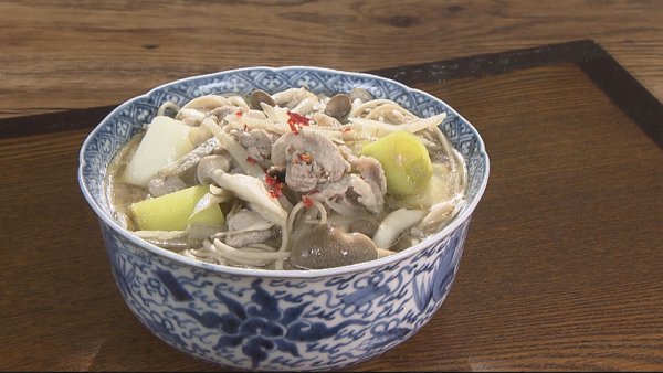 (3)材料が煮えて味がしみたら、そばをお湯であたため直し、湯切りして器に盛り、汁と具材を注いで、粗みじん切り唐辛子をあしらいます。
