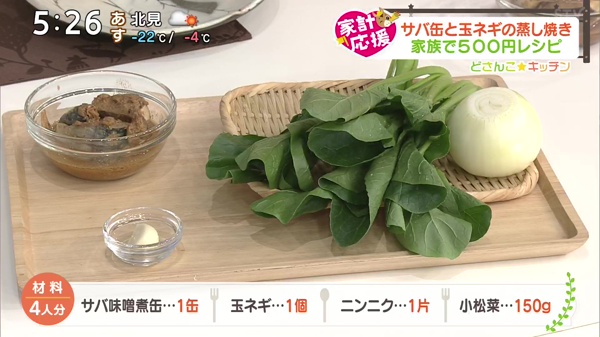 サバ味噌煮缶1缶、玉ネギ1個、ニンニク1片、小松菜150g、油大さじ1杯