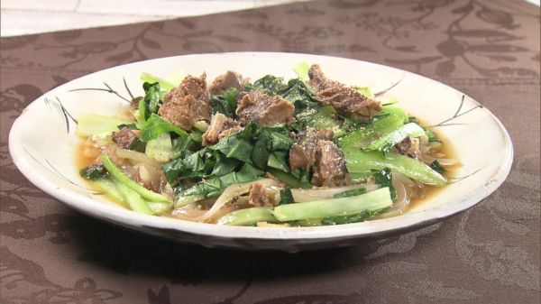 (2)フライパンに油を熱してニンニク、玉ネギを炒め、サバの味噌煮を汁ごと入れ、小松菜をのせます。調味料を全体に回しかけ、フタをして蒸し焼きにします。