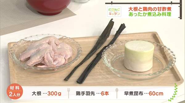 (1)大根は1.5cm幅の半月切りにします。鶏手羽先は裏側の骨の中央に切り目を入れ、関節から先を切り落とし、酒とコショウをまぶします。早煮昆布はサッと水にくぐらせて15cm長さに切って結びます。