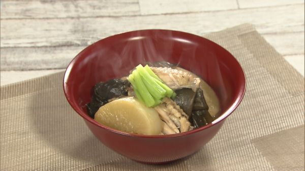 (3)そのまま冷まして味を馴染ませ、食べる時に温め直します。器に盛り、ゆでた大根の葉をあしらいます。