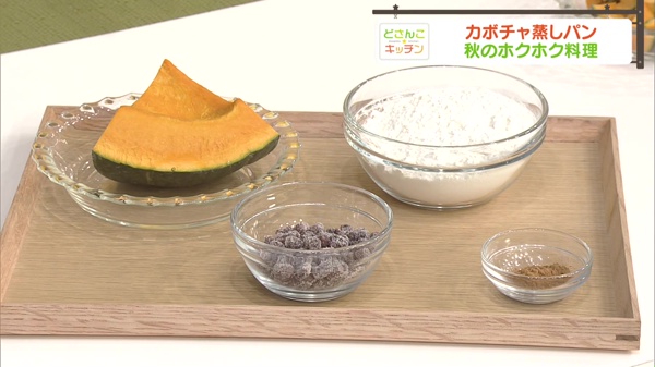 カボチャ正味200g、水カップ2/3杯、ホットケーキミックス150g、シナモンパウダー小さじ1杯、小豆甘納豆50g、油適量