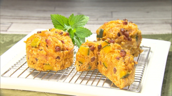 (1)カボチャは、半量を皮をむいて一口大の薄めに切ります。残りの半量は皮をつけたまま1cm角に切り、合わせて分量の水で煮ます。火が通ったら角切りのカボチャを取り分け、煮汁ごと潰して冷まします。