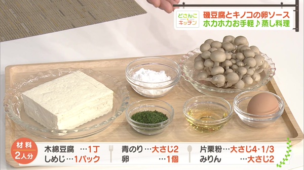 豆腐に、青のりと片栗粉をまぶして蒸した料理です。シメジと一緒に蒸すことで旨味も出ます。いただく時の、豆腐の滑らかさが嬉しい一品。ソースは小鍋で作る事が出来ます。魚にも合う卵ソースを覚えておくと、様々な場面で重宝です。