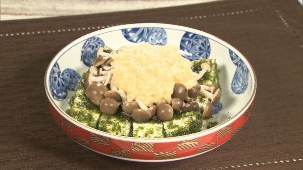 (2)豆腐を12等分に切ってから、片栗粉と青のりを混ぜた衣を絡ませて皿に並べ、石づきを取ってほぐしたシメジを上にのせます。
