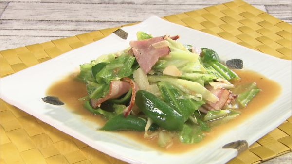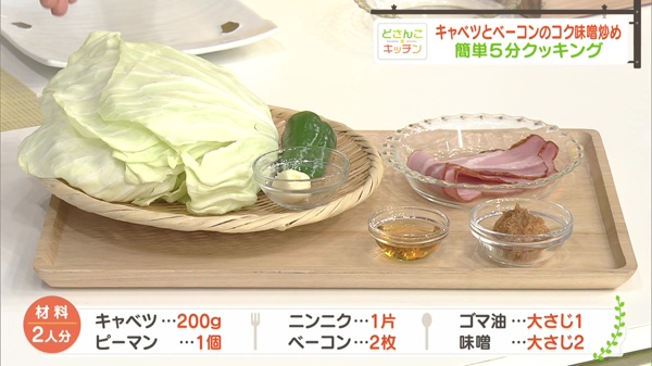 キャベツ200g、ピーマン1個、塩・油各少々、ニンニク1片、ベーコン2枚、ゴマ油大さじ1杯