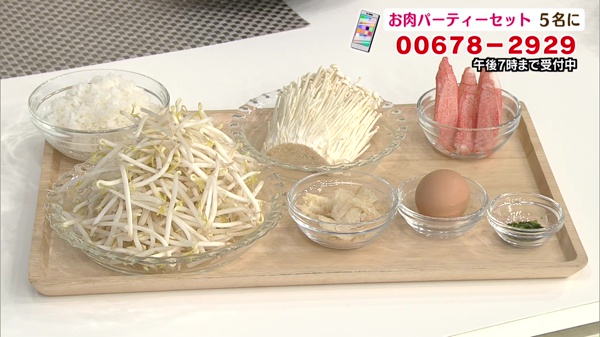(1)もやしは、根が目立つものは取ります。エノキ茸は、石づきを切って長さを半分にします。カニかまぼこは大きめにほぐします。
