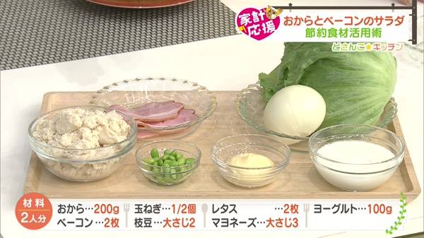 おから200g、ベーコン2枚、玉ネギ1/2個、油大さじ1杯、酒大さじ2杯、枝豆大さじ2杯、レタス2枚