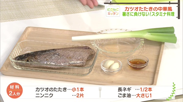 カツオのたたき小1本、ニンニク2片、長ネギ1/2本、ごま油大さじ1杯