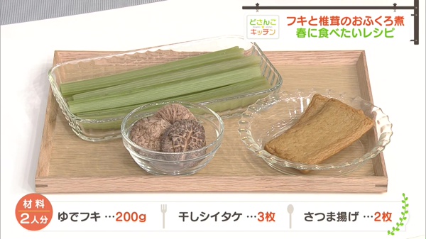 ゆでフキ200g、干しシイタケ3枚、さつま揚げ2枚、油大さじ1杯、干しシイタケの戻し汁カップ1/4杯