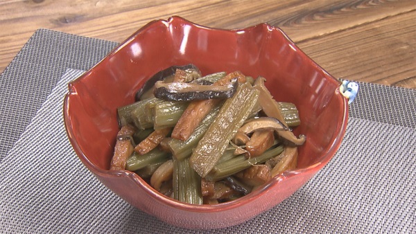 (2)鍋に油を熱し、フキとシイタケを炒めてから、さつま揚げと調味料、干しシイタケの戻し汁を入れて混ぜ、中火で15分程煮ます。上下を返し、冷めるまでおいて味を馴染ませます。
